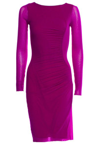 A vibrant mesh sheath by Jean Paul Gaultier. This slim, curve-fitting dress is detailed with a curved, ruched seam through the front and back. Boat neckline. Long, raw-edged sleeves. Lined in bright, slinky jersey. Semi-sheer. Fabric: Stretch mesh. 100% polyamide. Color: 459 Magenta Made in italy.