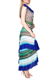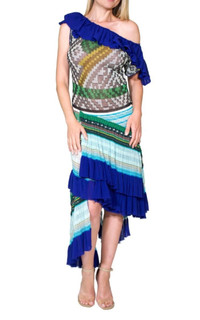 Missoni metallic crochet-knit dress The fluttering cobalt ruffles and the carefree one-shoulder cut add feminine charm to this bold style. Multicolored metallic crochet-knit Mixed patterns, cobalt crochet-knit ruffled trims, asymmetric tiered wrap-effect skirt Slips on 50% cotton, 16% rayon, 13% nylon, 13% rayon cupro, 8% polyester Dry clean