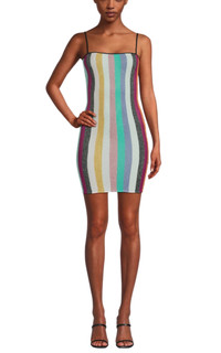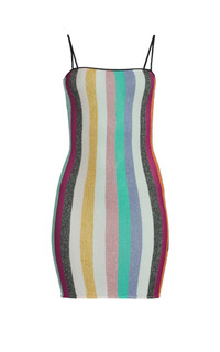 The short sleeveless dress, in lame rib knit, stands out for its fitted design and refined texture. The thin straps and the striped workmanship, embellished with lurex accents, give the garment a contemporary elegance. Ideal for those looking for a refined look, which combines brightness and versatility in a single piece. 79% Rayon, 21% Metal Fibre Squareneck Shoulder straps Pull-on Made in Italy
