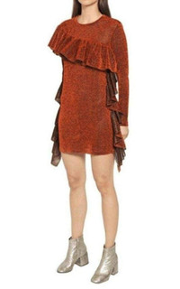 FINAL SALE Metallic copper ruffle trim dress from MM6 Maison Margiela featuring ruffle trims. Designer Style ID: S32CT0816S22858 Designer colour: 904 Long sleeves Ruffles on front and sides Lined Sample 70% POLYAMIDE, 30% POLYESTER Linning:100% Polyamide Item fits true to size Made in Italy
