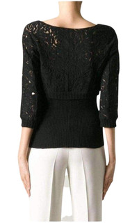 Black wool blend sweater Round neck Long sleeves with ribbed cuffs Lace top Ribbed bottom Straight hemline. Composition: Fabric 1: Wool 80%, Polyamide 20% Fabric 2: 100% Silk Fabric 3: 94% Wool, 5% Polyamide, 1% Elastane Dry Clean Only.
