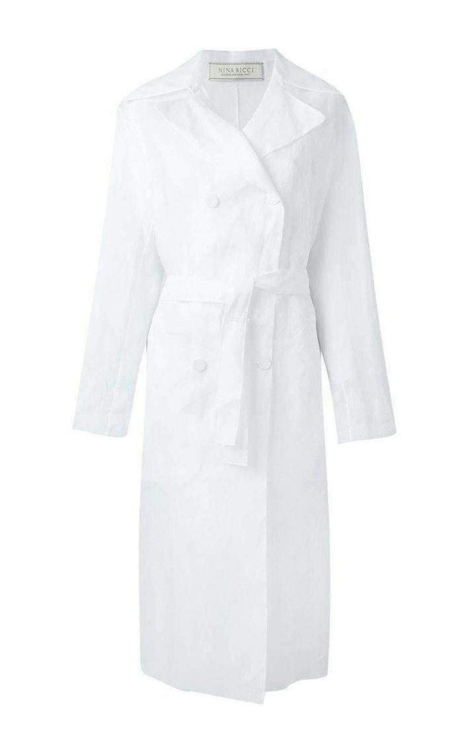 Crafted entirely in France, this Nina Ricci overcoat exudes ethereal elegance in white organza mesh. Semi sheer, maxi length overcoat with wide notched collar. Double breasted button closure with self covered buttons. Two pockets Composition: 100% cotton Organza This style fits true to size Made in France