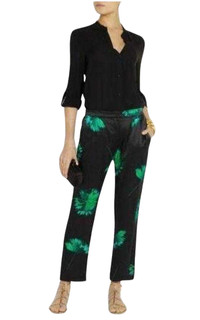 Green and black floral-print silk satin pants. Flat front, cased elasticized waist at back Two on-seam pockets, two button-through pockets at back Piping at leg sides. Approximately 10" rise, 25" inseam, 16" leg opening. Button fly and bar-and-hook closure. 100% Silk. Dry clean. Fits true to size, take your normal size Mid-rise, straight-leg fit Cropped length Partially elasticated at the waist for a flexible fit Made in Portugal.