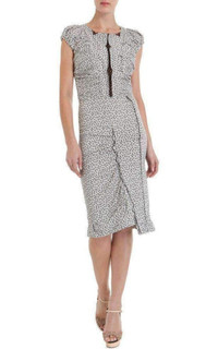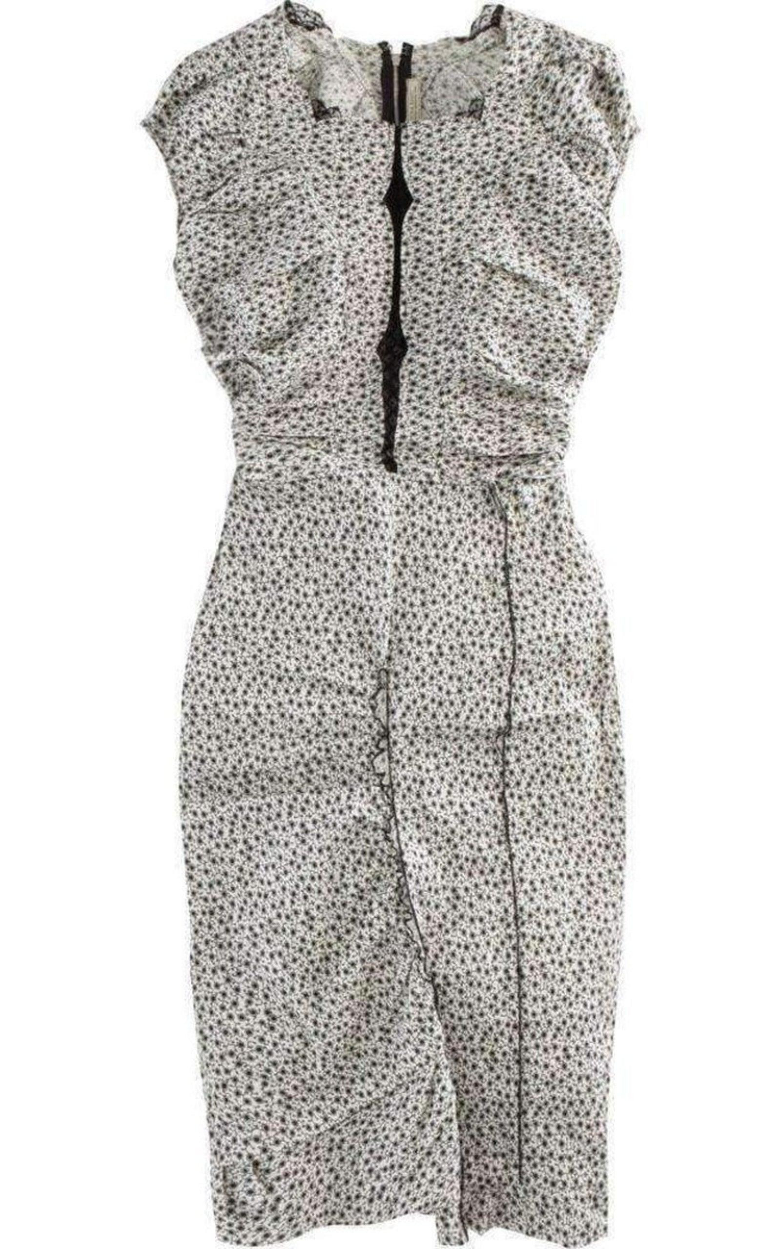 Linen blend cap sleeve scoopneck sheath dress with lace keyhole placket and trim and back zip in provincial floral print. 81% Linen, 14% Polyamide, 5% Elastane 42" length. Dry clean Made in France