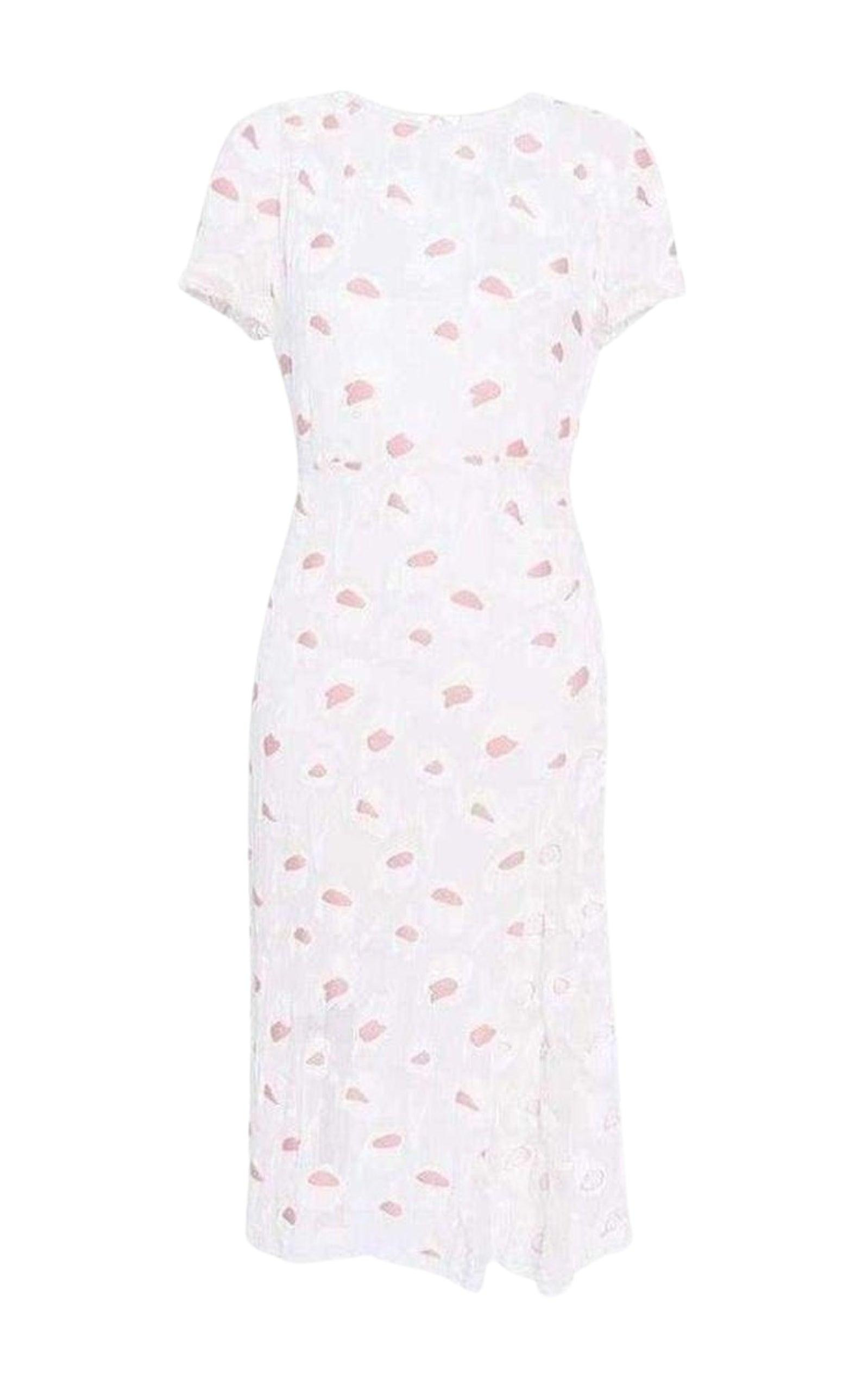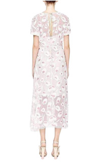 This dress is crafted in tactile, flocked silk chiffon with a charming floral pattern. A reversed panel accents one side of the airy skirt, and delicate lace trims the hem. Silk-covered buttons fasten the back, and a slim strap ties behind the neck. Short sleeves and rolled cuffs. Silk slip-dress lining. Semi-sheer. Fabric: Flocked silk chiffon. 60% viscose, 24% silk, 16% polyester Lining: 100% Silk Dry clean. Made in France FR 36: Bust: 36" Waist: 30" Hip: 38"