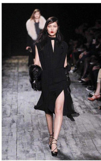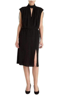 Silk sleeveless dress with tab closure at high collar. Sheer blouson overlay at back bodice. Side slits at skirt. 45" length. Color Black. 100% Silk. Dry clean. Style # 502153948