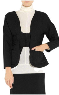 Black wool blazer from Nina Ricci featuring an open front Two front patch pockets Seam detailing Flared hemLong sleeves 73% wool, 27% polyester; lining: 100% silk. Dry clean. Made in France