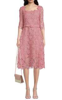 This sophisticated midi dress from Oscar de la Renta is made from guipure lace and lined with organza and crêpe de chine. It has a square neckline, elbow-length sleeves and a midi hem. Square neckline Three-quarter sleeve Belted waist Concealed back zipper closure Knee-length Fit-and-flare silhouette Material: 100% polyester Lining: 100% silk, partially lined Dry clean Made in Italy