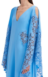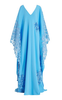Tailored from powder-blue stretch-silk georgette, this stunning caftan gown has a free-flowing silhouette trimmed with gardenia-patterned guipure lace along the cascading side panels. Long cape sleeve V-neckline Relaxed silhouette Floor sweeping hemline Side slits Slip on Composition: 94% silk; 6% elastane; Trim: 100% polyester Designer color: Powder Blue Dry clean Made in USA Have Questions about us, read our FAQ