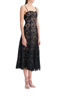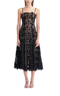 Square neckline Fixed spaghetti straps Black lace eyelet design with tan under-layer A-line silhouette Lined Midi length Invisible zipper at side with hook and eye closure Material: 100% polyester Material II: 80% polyester, 20% cotton Lining: 100% silk Made in Italy