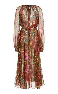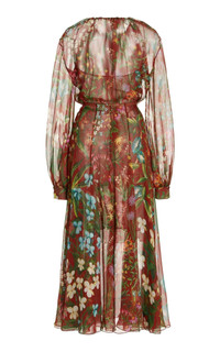 Floral tapestry motif Button front Long balloon sleeves Button cuffs A-line silhouette Midi length Lined Composition: 100% Silk Dry clean Made in Italy