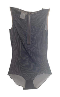 This sleevless bodysuit features a mesh design Round neck. Back zip Material: 80% polyester, 20% spandex Color: Black Unlined