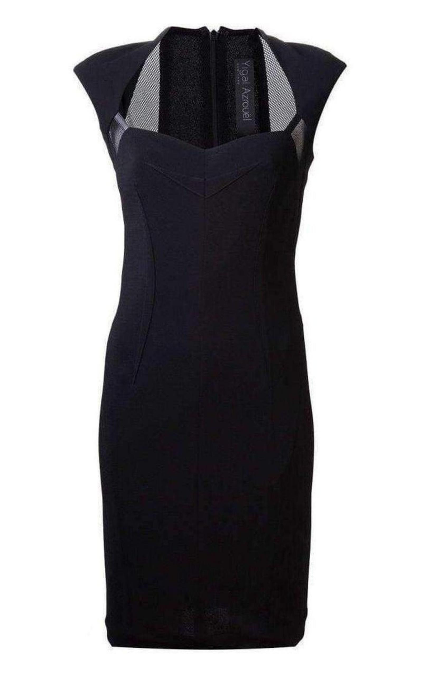 Jet viscose blend matte dress from Yigal Azrouël featuring a sweetheart neck, side mesh panels with leather trimming, concealed back zip fastening with mesh panels, and short length. Self 65 % Viscose, 15 % Nylon Combo 100% Poly, Trim 100% Lambskin Length: 37" Color: Black