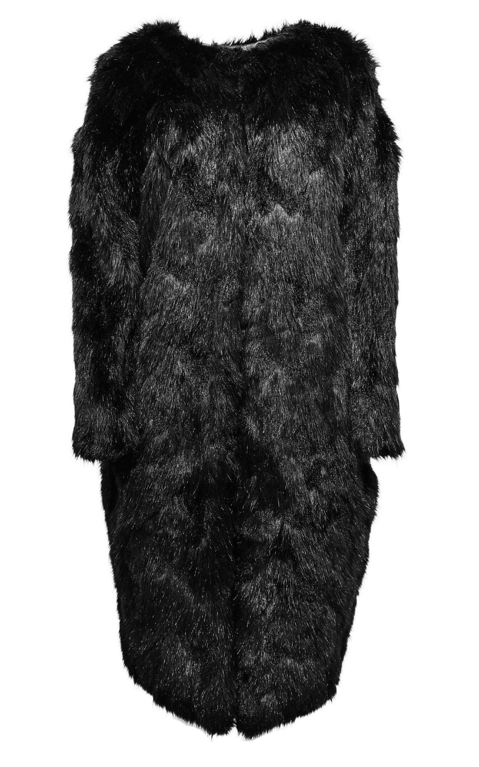 Black oversized faux fur coat from Tiger in the Rain featuring, long sleeves, a mid length and a straight hem. Color: Black. Material 1: 80% Acrylic 20%Polyester. Material 2: 100% Polyurethane Lining: 100% Polyester Fur type: Faux Made in Korea Dry clean
