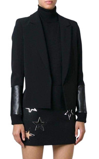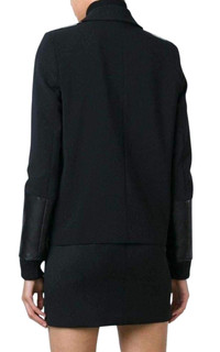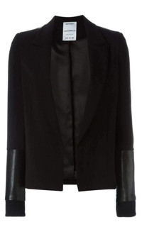Black lambskin contrast sleeve blazer from Anthony Vaccarello. Composition: Lamb Skin 100% Lining Composition: Viscose 50% , Acrylic 50% Composition: Polyester 92%, Polyurethane 8% Dry Clean Only Measurements: Armpit-to-armpit 18.5", Shoulder-to-shoulder 15.5", Collar-to-bottom 24" Made in Italy