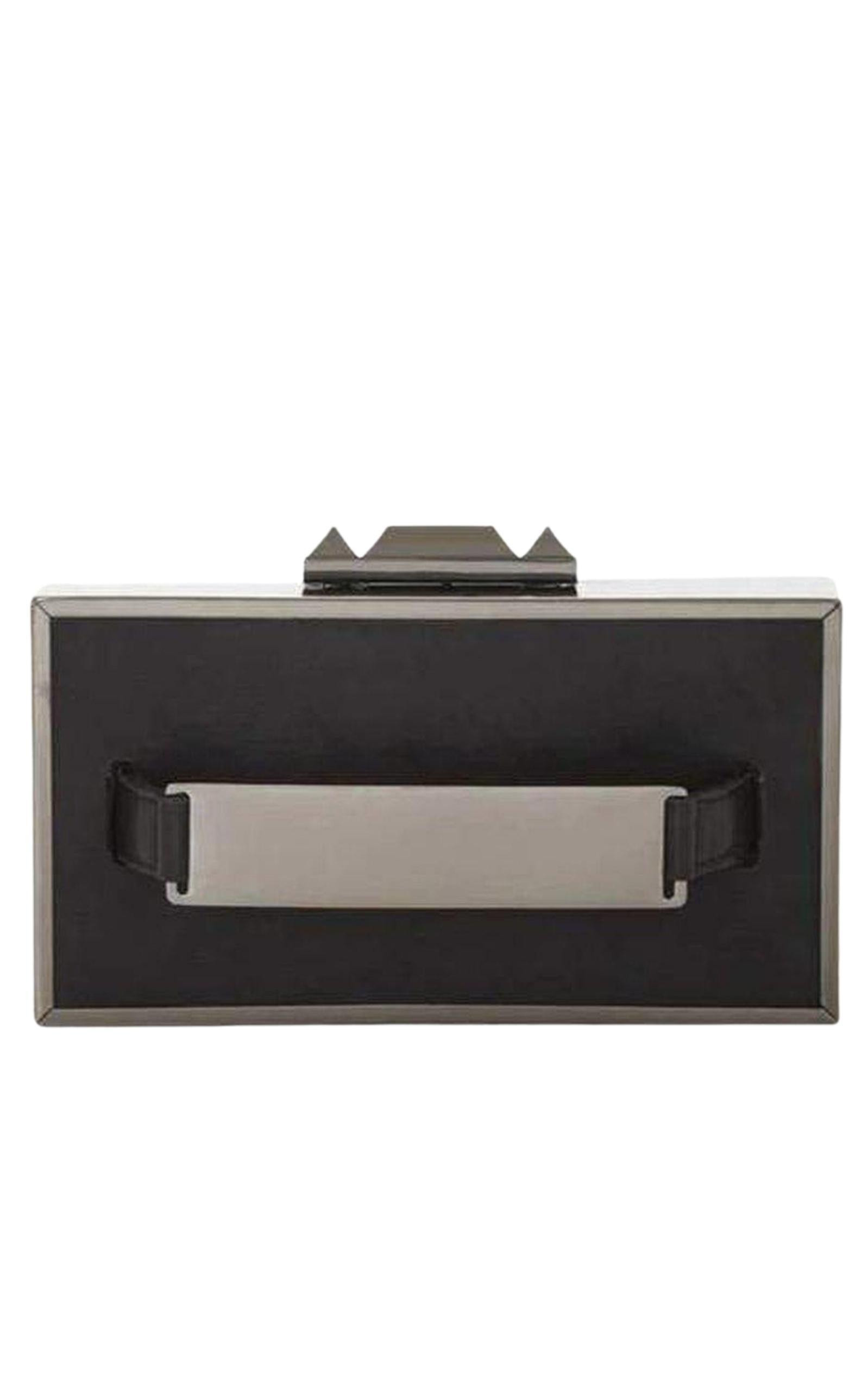 Cute and uniquely chic, this box clutch is a real head-turner. Box clutch with faux-leather inlay. Metal frame. Metal handle at side. Pyramid-stud detailed latch top. Drop-in removable chain strap. Clasp closure. Faux leather, metal. Color: black