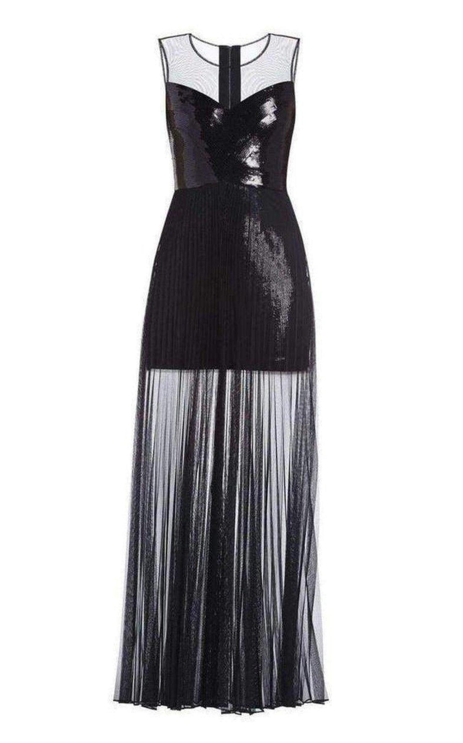 Elongate your form while stealing the show in this unforgettable sequined-detail gown. Crewneck. Sleeveless. Sheer fabric yoke. Sequin detailing throughout. A-line tulle skirt overlay with sunburst pleating. Floor-length hemline. Exposed center back zipper closure. Self: Polyester, Rayon, Spandex. Contrast: Polyester tulle. Lining: Polyester, Spandex jersey. Dry Clean