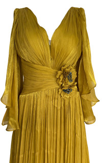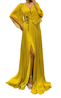 Step into elegance with this Elegant Chiffon Evening Dress Gown with Floral Brooch, designed to turn heads. The gown features a plunging V-neckline that gracefully complements a crinkled A-line skirt, creating a mesmerizing flow with every step. The dreamy 3/4 fairy sleeves add a touch of whimsy, while a delicate floral brooch at the high waist draws attention to the figure-flattering silhouette. Below the bust, subtle ruching enhances the bodice, adding texture and shape. Perfect for any formal occasion, this gown captures an aura of romance and sophistication. Have Questions about us, read our FAQ Runway Catalog on other Marketplaces We are here to serve you, contact us and follow us @runwaycatalog