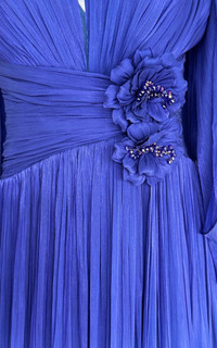 Step into elegance with this Elegant Chiffon Evening Dress Gown with Floral Brooch, designed to turn heads. The gown features a plunging V-neckline that gracefully complements a crinkled A-line skirt, creating a mesmerizing flow with every step. The dreamy 3/4 fairy sleeves add a touch of whimsy, while a delicate floral brooch at the high waist draws attention to the figure-flattering silhouette. Below the bust, subtle ruching enhances the bodice, adding texture and shape. Perfect for any formal occasion, this gown captures an aura of romance and sophistication. Have Questions about us, read our FAQ Runway Catalog on other Marketplaces We are here to serve you, contact us and follow us @runwaycatalog
