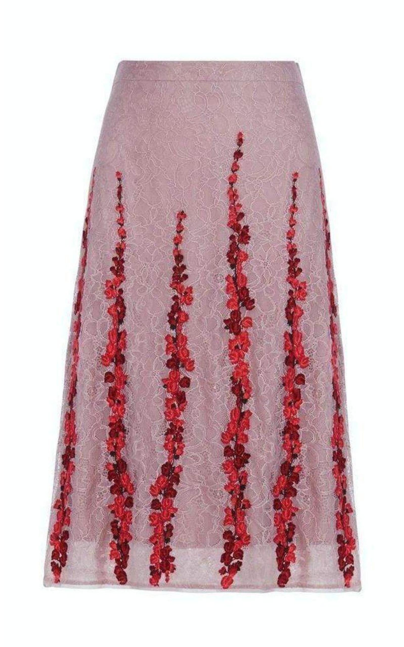 Up the romance in a sultry midi skirt, emblazoned with fluttering bougainvillea embroidery set against semi-sheer lace. Semi-sheer. Concealed side zipper closure. Self: Embroidered fluttering bougainvillea on lace - nylon. Contrast: Mesh - polyester. Lining: Stretch poplin - cotton, nylon, spandex. Color; soy chai combo Washable Lightweight, non-stretch fabrics. Sits at the waist. Hits below the knee. True to fit.