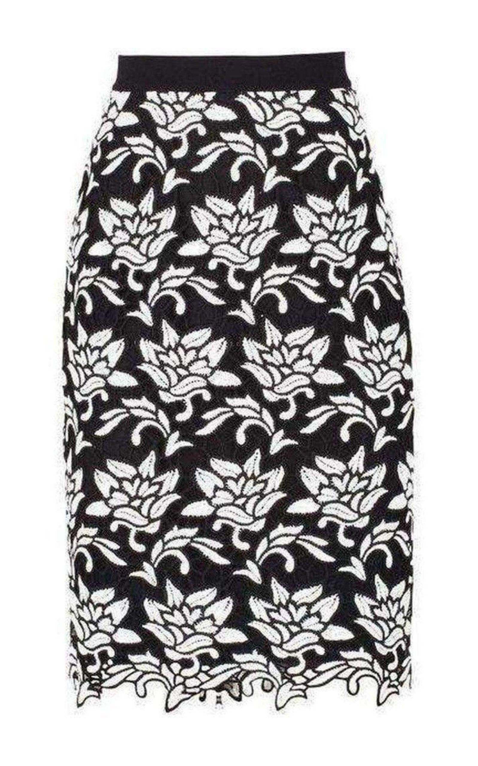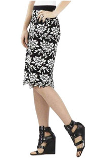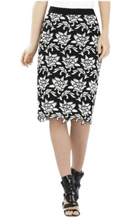 Seize the day and stunning style in this sophisticated pencil skirt featuring a romantic floral hemline. Sits at the waist. Elasticized waistband. Pencil skirt silhouette. Floral-edge hemline. Allover large embroidered floral lace knit. Exposed center back two-way zipper closure. Self: Polyester lace. Contrast: Polyester mesh. Lining: Polyester crepe de chine. Machine Wash.