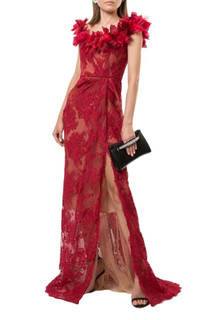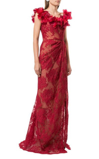 This exquisite gown is topped with a diaphanous floral appliqué across an off-the-shoulder neckline, mirroring the florals in its lace overlay. It has a subtle drape at the hip and a cut-up-to-there side slit edged with delicate scallop trim. Off-the-shoulder neckline Cap sleeves Concealed back zip Floral appliqué Fitted waist Front slit Scallop trim Silk lining Polyester/rayon Dry clean Made in USA