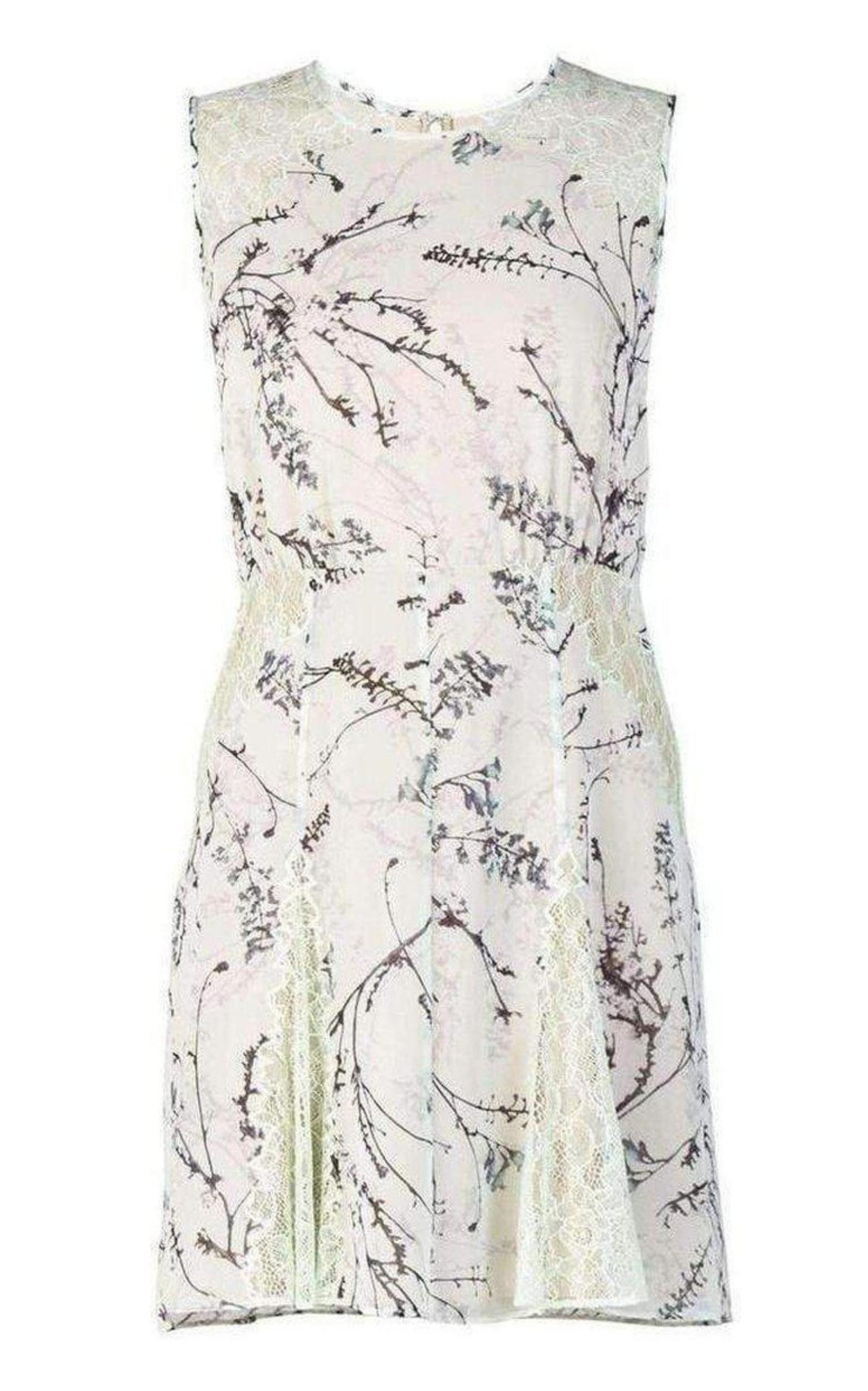A delicate Branching Blossom print lends a certain springtime sensuality to this coquettish style. Round neckline. Sleeveless. Keyhole detail at back. Dropped seamed waistline. Flared skirt. Hits above the knee. Allover Branching Blossom print. Self: Polyester georgette. Contrast 1: Polyester lace. 2” Polyester tulle. Lining: Polyester. Hand Wash.