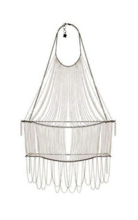 Accessorize your night-out ensemble with this alluring body piece, adorned with cascading chains for a head-turning look of glamour. Body chain. Halter neckline. Multi-chain front. Open back. Looped chain asymmetrical hem. Adjustable lobster-clasp fastenings at back neck and sides. Material: Iron, Copper, Zinc alloy. Measures approximately 27” in circumference at waist. One size fits most.