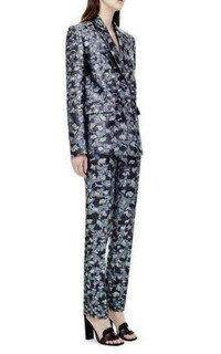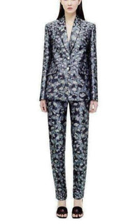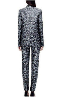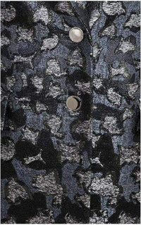 Jacquard lame blazer with cookie cutter pattern Slender notched lapel Full-length sleeves Flap front pockets Single vent at back. Single breasted button fastenings Fabric: 73% Silk, 27% Polyeter Lining: Coupro Made in UK Measurements: 33" bust; waist 26"; 38" hips; length 28" Ttrue to size