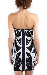 Angular, contrasting panels form a faceted pattern on this fitted, strapless Herve Leger dress. Side boning and interior elastic straps offer extra support to the sleek bodice, and a hidden zip closes the back. Unlined. Fabric: Double-knit slinky jersey. 75% rayon/23% nylon/2% spandex. Dry clean.