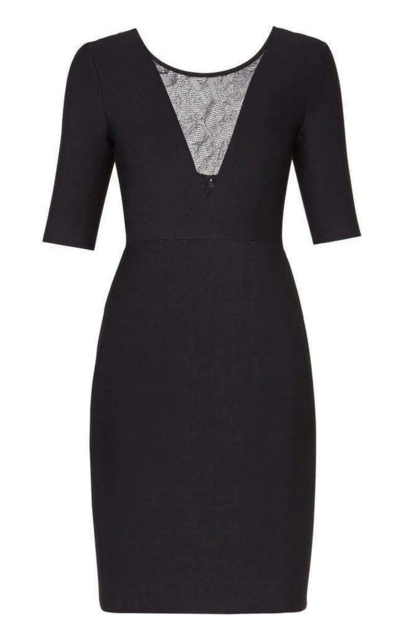 Effortlessly alluring yet timelessly sophisticated, this sculpting silhouette features a plunging sheer neckline and unexpected scooped back. Accessorize the little black dress with anything from streamlined sandals to pointed-toe pumps. Back zipper closure. Self: Rayon, nylon, spandex knit. Trim: Pointelle - rayon. Unlined. Stretch knit fabric. Body-con silhouette. Hits above the knee. Fitted. Dry clean