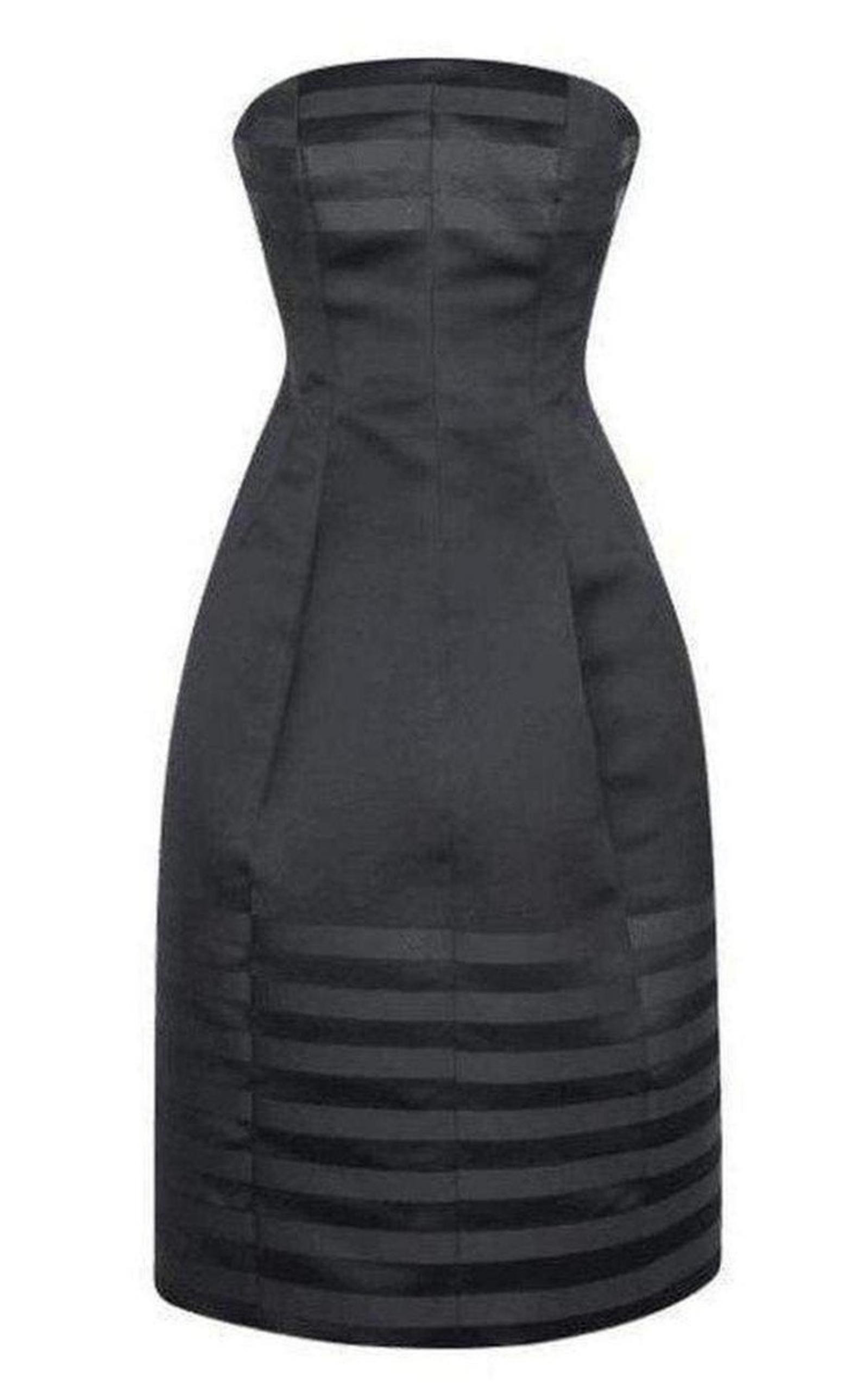 This strapless satin cocktail jonathan saunders dress features a bustier-style bodice with boning Tailored waist Matte black stripes at the bust and hem. Exposed zip back closure. 100% polyester. Fully lined. Color: Black/Matte Black Made in UK
