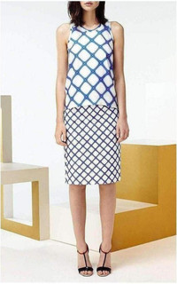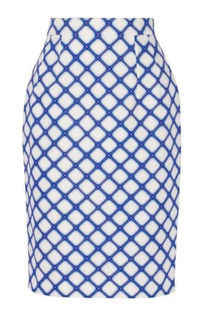 Jonathan Saunders blue, white and coral skirt. Printed textured-cotton. Back vent. Concealed hook and zip fastening at back. 100% cotton. Dry clean. Fits large to size, take one size smaller than normal. Knee-length, sits at the waist. Mid-weight, non-stretchy fabric.