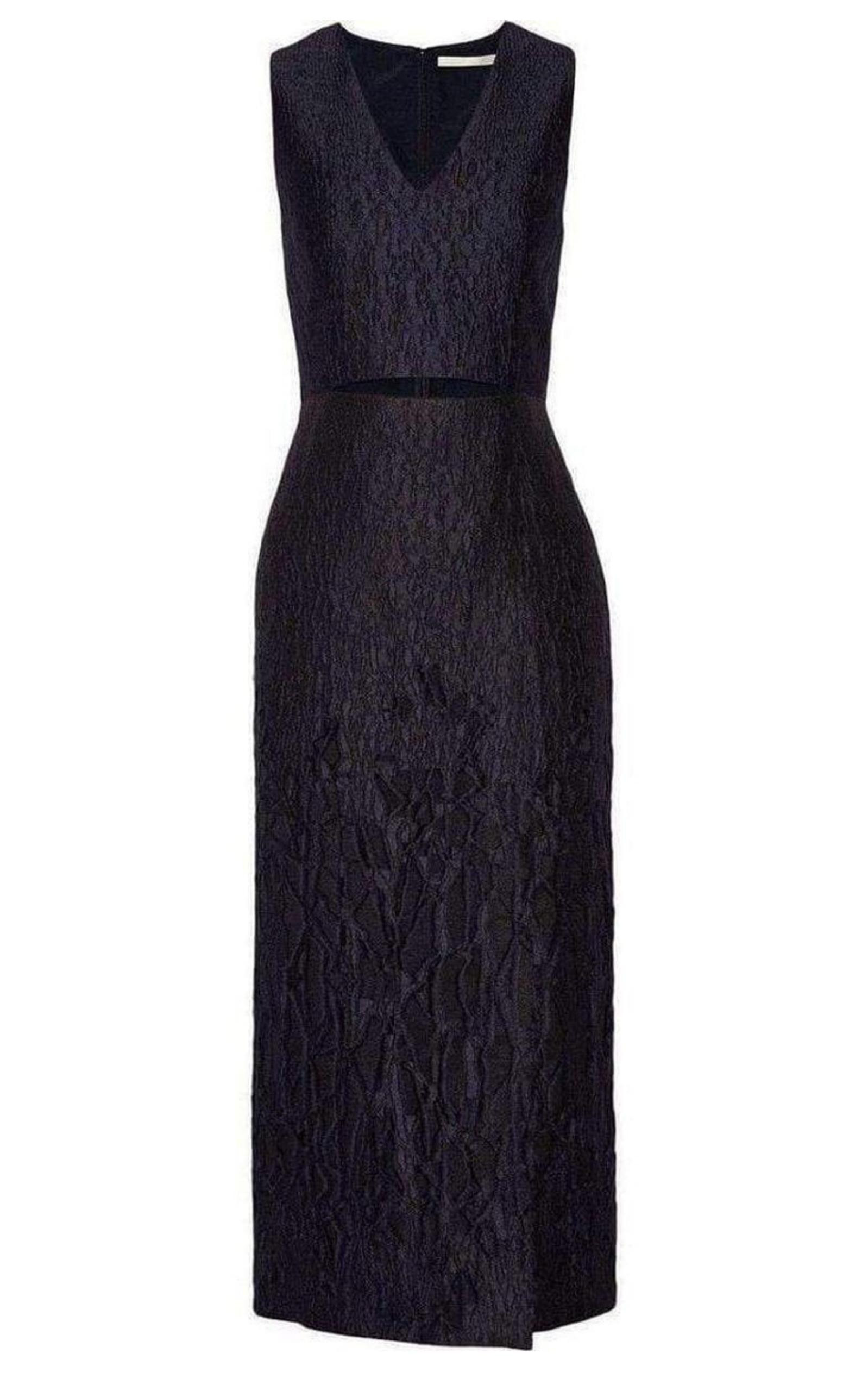 A soaring front slit and deep V-neckline lend breathtaking allure to a svelte sleeveless dress cut from richly textured chiffon and finished with a slender cutout at the waist. Flocked cloqué. Front cutout, front split, fully lined. Concealed hook and zip fastening at back. 67% polyester, 17% nylon, 16% silk; lining: 100% polyester. Dry clean or hand wash. Fits true to size, take your normal size. Tailored for a slim fit. Mid-weight, non-stretchy fabric. Measurements for sz 8 Length 51" Bust 34.5" Waist 30" Hip 38"