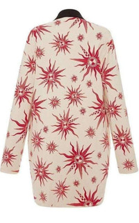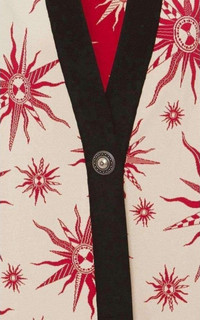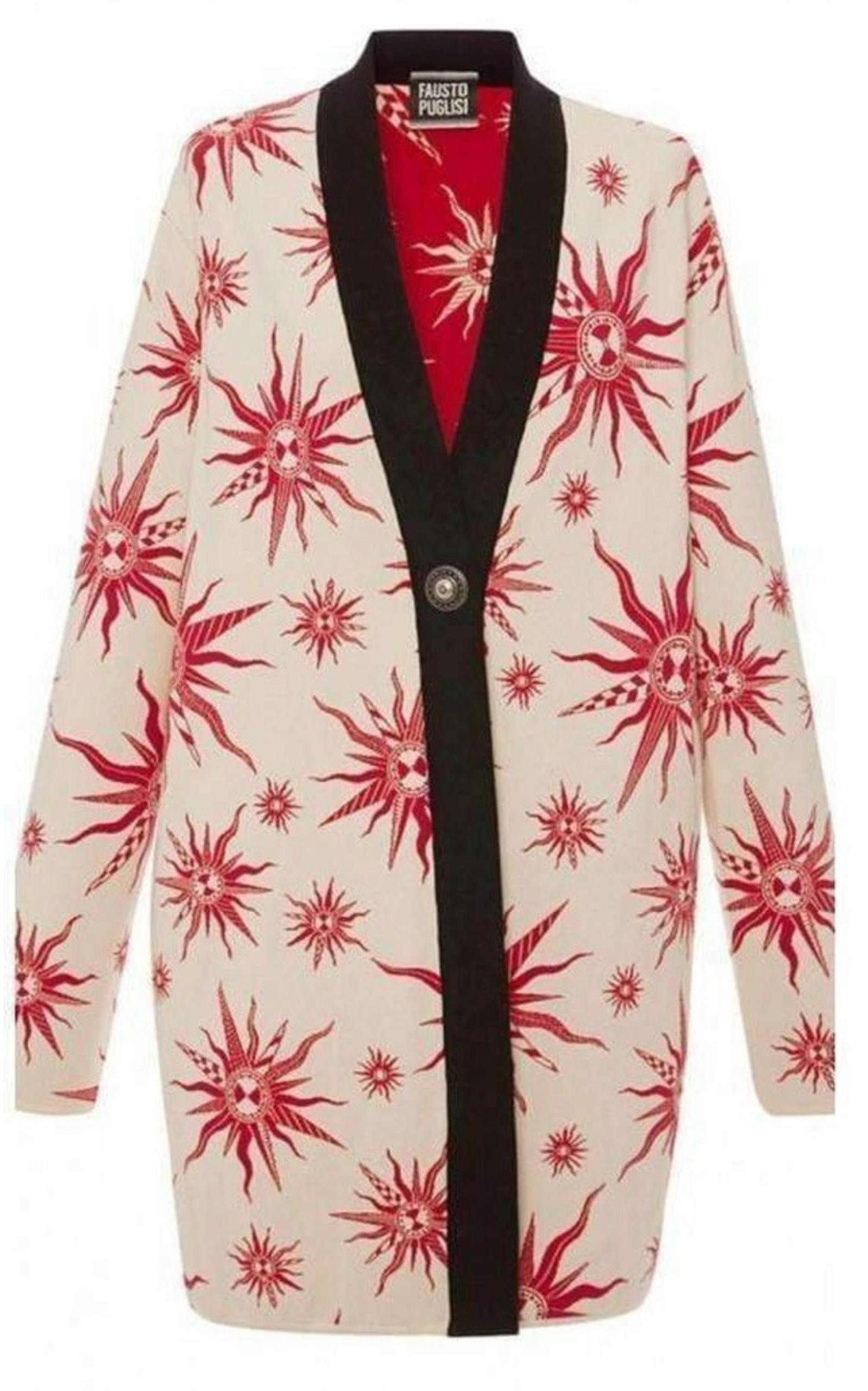 This oversized Fausto Puglisi coat features a knit construction with collarless neckline framed in a contrasting black and an allover sun print Front button Two pockets Material1: 73% viscose, 25% polyamide, 2% elastane Material2: 78% acetate, 22% Silk Color: Ivory/Red Unlined Made in Italy This style fits true to size