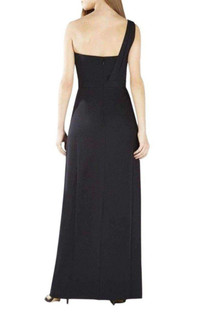 A very romantic gown featuring a draped peplum at the waist for effortlessly chic evening looks. Asymmetrical neckline. Sleeveless. Single shoulder strap. Draped asymmetrical peplum at waist. Wrap skirt with slit at front. Boning at bodice. Center back zipper with hook-and-eye closure. Satin: Polyester. Crepe de chine: Polyester. Machine Wash.