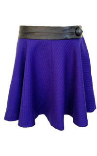 Lustrous, fine-grain leather bands the wide waistline skirt. Self: 100% wool Combo: 100 % lamb leather Lining: 100 % poly Skirt measures approx 18" / 46 cm in length Fully lined Leather waistband Side seam zipper closure
