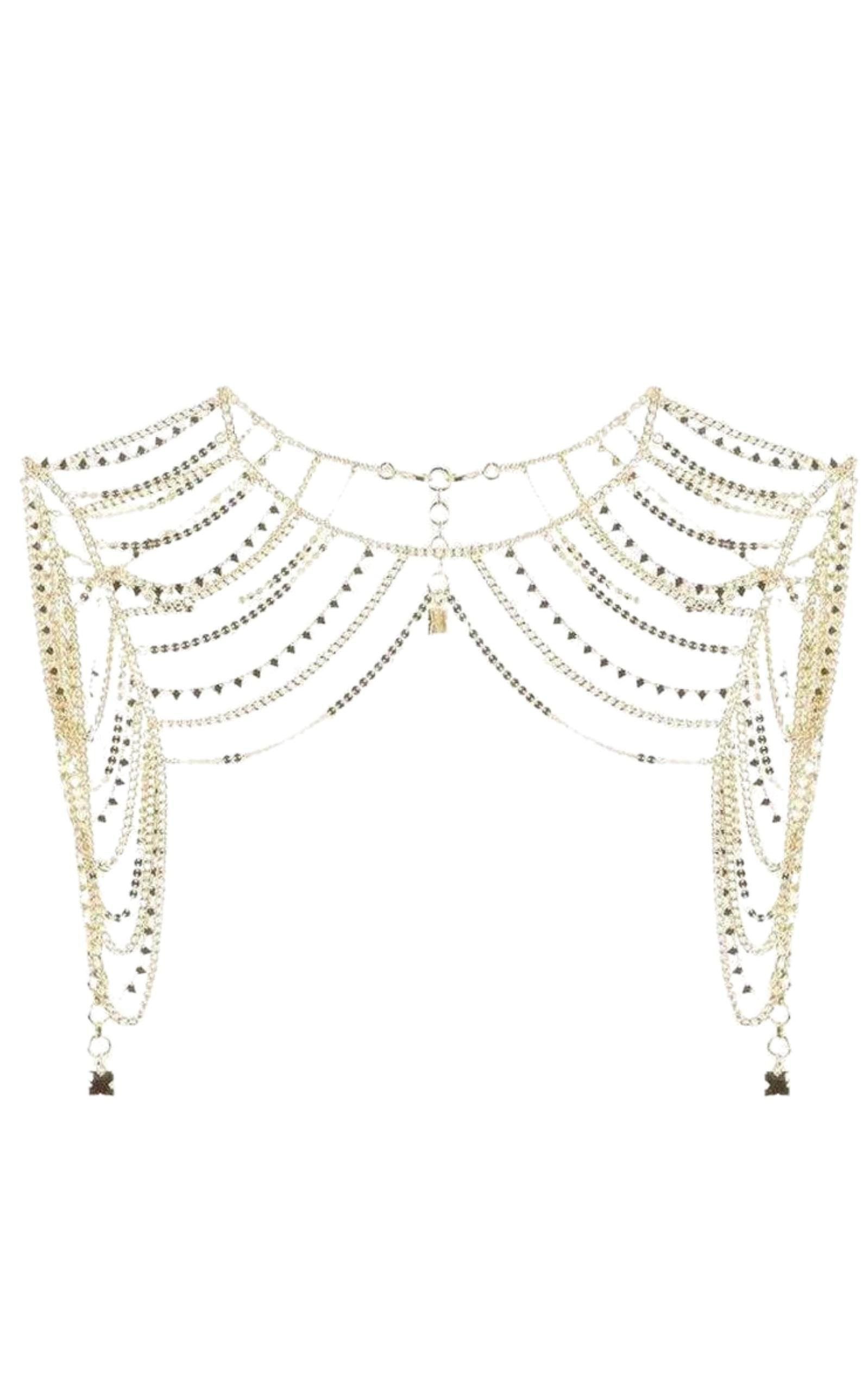 For a glamorous finish to your body-con silhouettes, drape this statement tiered chain shoulder piece over top. Body chain. Multi-strand chains with pyramid detail throughout. Open back. Adjustable length with lobster-clasp fastening and signature icon hardware at back neck. Material: Copper Alloy