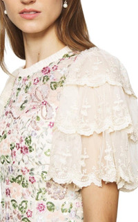 Discover the stunning, chic design of this sequin-detailed midi dress. Featuring tiered lace sleeves and a ruffled roundneck, elevate your look with the perfect balance of elegance and glamour. With bust darts and zip closure on the back, this dress is both stylish and practical. Luxurious sparkle and intricate detailing of sequins throughout. 100% polyester Dry clean SIZE: US 2/EU 34/ UK 6