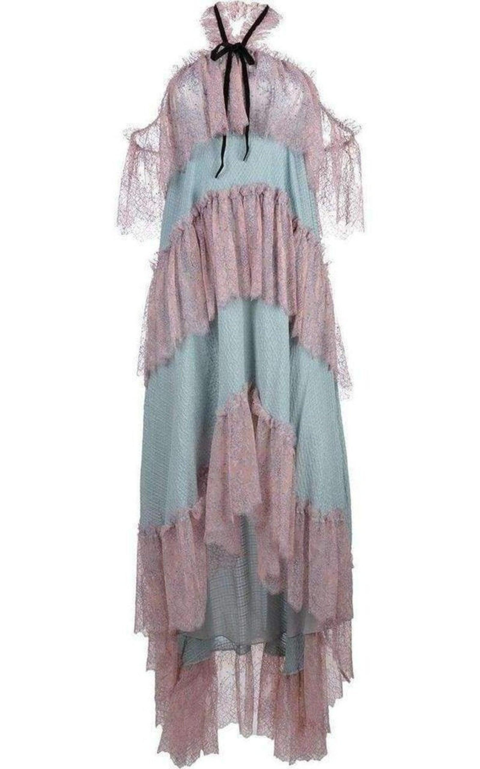 This Philosophy di Lorenzo Serafini dress features an a-line silhouette with a halter style. Modified off-the-shoulder neckline. Tiered ruffles. Back button closure. Composition: 100% silk. Lining: Polyester. Color: fantasy print grey. Fully lined. Made in Italy
