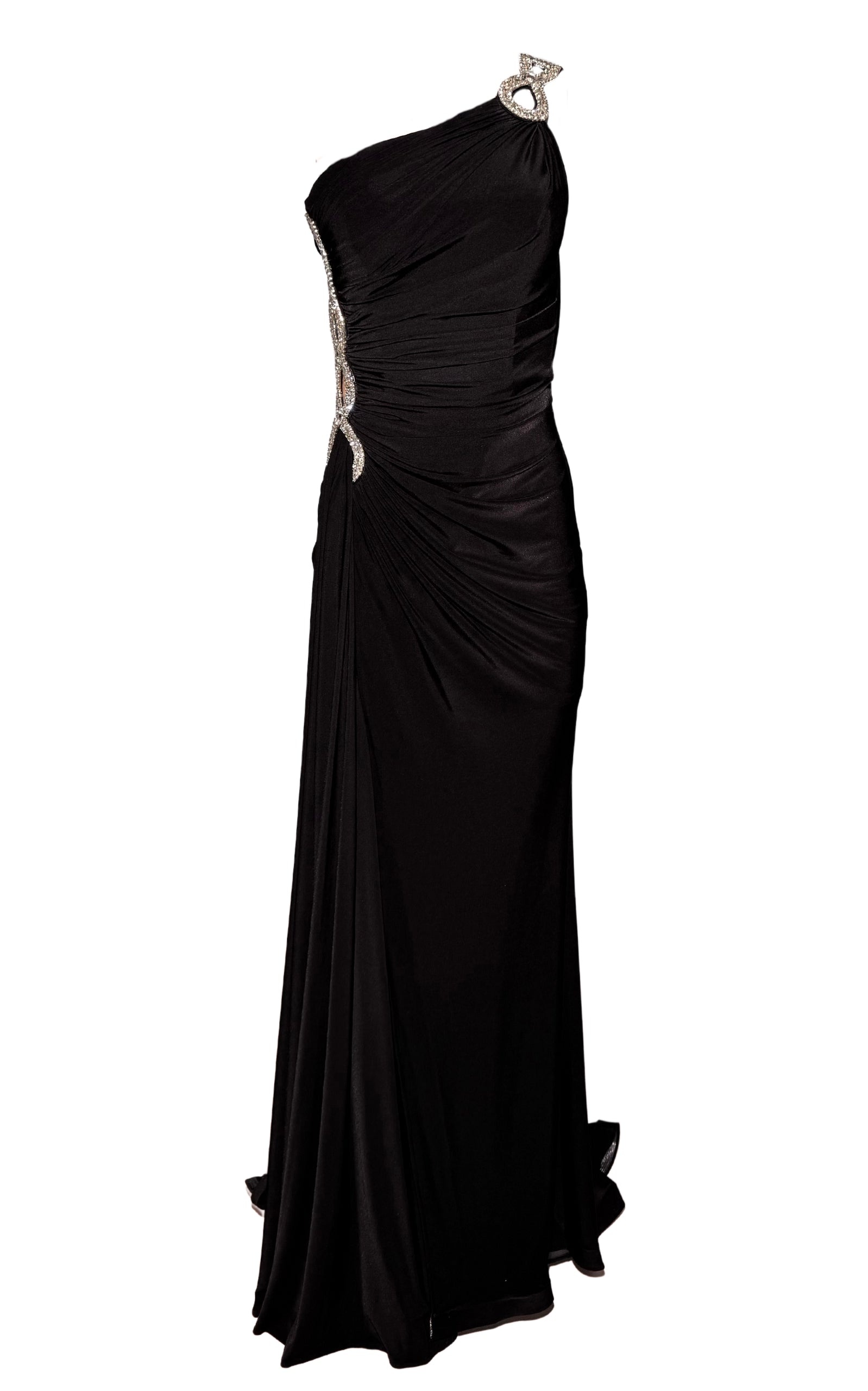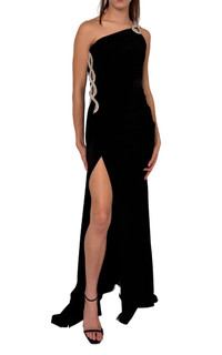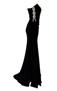 One Shoulder Beaded Stretch Gown in Black perfect for Prom, bridesmaids, and cocktail parties. Sleeveless Beaded waist and shoulder embellishment Front slit Fully lined Side zip closure approx. 48" length from waist Material: polyester Dry clean Have Questions about us, read our FAQ