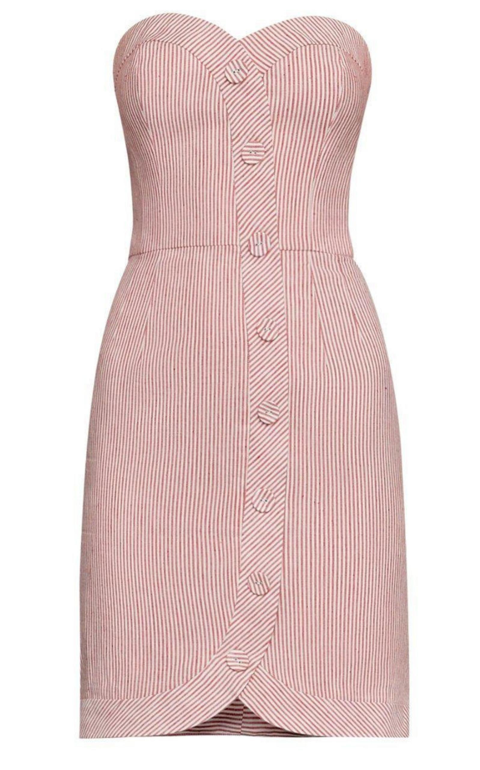 Flaunt your own brand of "La Dolce Vita" style in BCBGMAXAZRIA's figure-flattering pinstripe bustier dress adorned with oversized decorative buttons and a flirtatious tulip hemline. Hidden back zipper with hook-and-eye closure Oversized decorative buttons at front; tulip hem Sheath silhouette Sweetheart neckline 57% Linen, 28% Polyeste, 13% Viscose, 2% Spandex Lining: Cotton Machine washable
