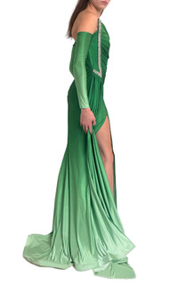 Step into the spotlight with this breathtaking Rhinestone Embellished Green Ombre Gown, perfect for prom or as a statement piece for a wedding guest ensemble. This dress is a harmonious blend of elegance and allure, designed to captivate. A dazzling array of rhinestones graces the bodice and the top of the bust, creating a sparkling focal point that catches the light with every movement. Thoughtfully designed to enhance your silhouette, the ruched bodice offers a flattering fit while adding a touch of texture and sophistication. A cascading ombre skirt transitions seamlessly from one enchanting hue to another, offering fluidity and a sense of ethereal beauty. Elegant faux sleeves provide a delicate, modern touch, enhancing the overall aesthetic without sacrificing comfort. High front slit Rhinestone embellishment at bust and side Back zipper closure 100% Polyester Have Questions about us, read our FAQ