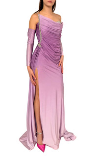 Step into the spotlight with this breathtaking Rhinestone Embellished Light Pink Ombre Gown, perfect for prom or as a statement piece for a wedding guest ensemble. This dress is a harmonious blend of elegance and allure, designed to captivate. A dazzling array of rhinestones graces the bodice and the top of the bust, creating a sparkling focal point that catches the light with every movement. Thoughtfully designed to enhance your silhouette, the ruched bodice offers a flattering fit while adding a touch of texture and sophistication. A cascading ombre skirt transitions seamlessly from one enchanting hue to another, offering fluidity and a sense of ethereal beauty. Elegant faux sleeves provide a delicate, modern touch, enhancing the overall aesthetic without sacrificing comfort. High front slit Rhinestone embellishment at bust and side Back zipper closure 100% Polyester Have Questions about us, read our FAQ