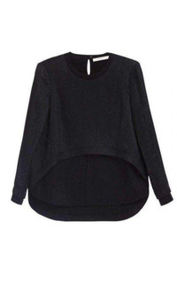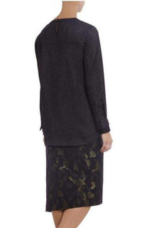 Crewneck. Long sleeves. Keyhole at back. High-low hemline. Slightly sheer underlayer bodice with front button-up closure. Ribbed jacquard detailing throughout. Self: Polyester, Acrylic, Nylon, Elastane jacquard. Contrast 1: Cotton pique. 2: 100% Silk crepe de chine. Hand Wash. Measures approximately 28.5" from shoulder to hem.
