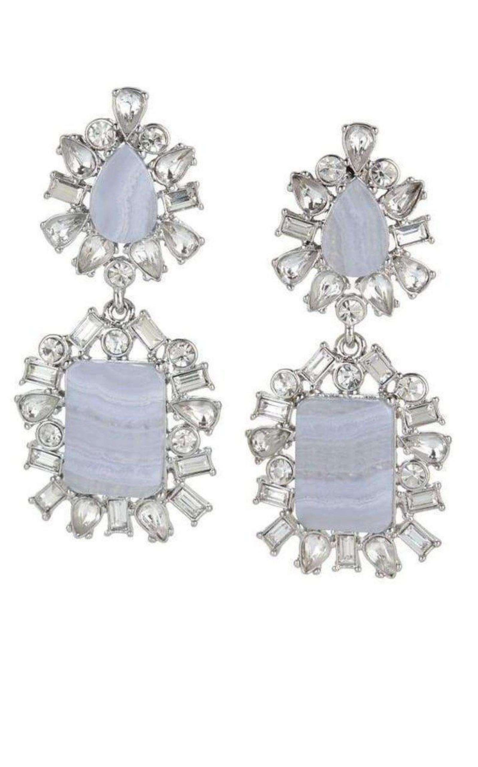 For opulence and timeless charm, opt for these scattered-stone drop earrings on romantic evenings out. Teardrop-stone studs with rhinestone-detail trim. Drops with square stones and rhinestone-detail trim. Post-back fastening. Copper Alloy, Semi-Precious Stone, Glass Measures approximately 2.5" in length