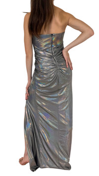 Elevate your evening look with our Silver Metallic Cocktail Prom Dress. This striking dress captures the essence of glamor with its radiant metallic hue that shimmers under any light. The strapless neckline offers a timeless, chic appeal, while the expertly designed ruching around the waist accentuates your curves, delivering an hourglass silhouette. A tasteful front slit adds a touch of sophistication, giving you ease of movement and a hint of allure. With a convenient back zip closure, this dress combines elegance and comfort effortlessly. Perfect for prom or any special occasion, this is the dress to make a lasting impression. Have Questions about us, read our FAQ Runway Catalog on other Marketplaces We are here to serve you, contact us and follow us @runwaycatalog