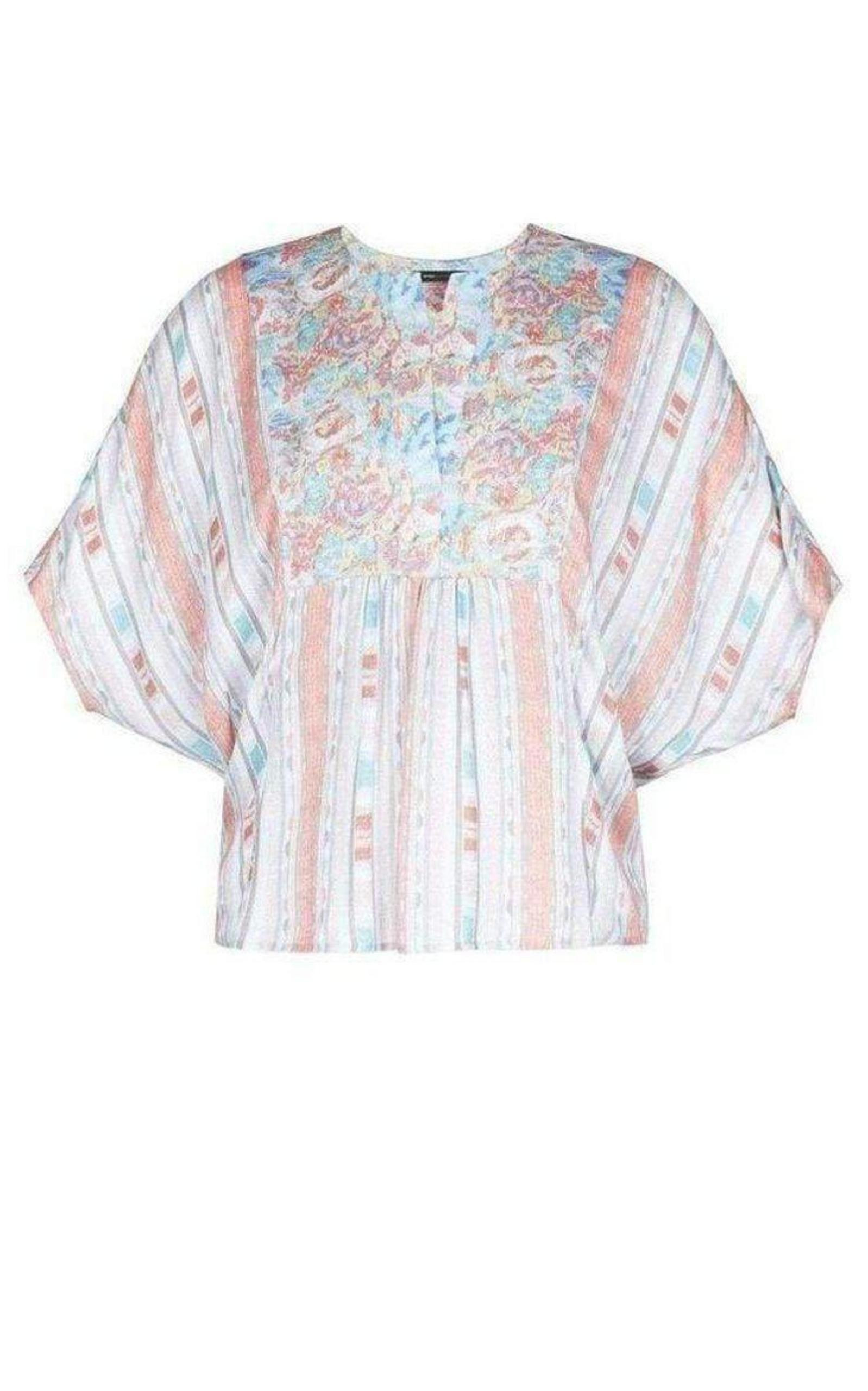 Romantic pastels and a relaxed silhouette make this an effortlessly chic choice this summer. Split V-neckline. Short sleeves. Cabbage Rose Tapestry print on center front placket. Ikat Ombre Jacquard print throughout. Empire seamed waistline with slight gathering. Asymmetrical hemline. Self/Contrast: Rayon crepe. Hand Wash.