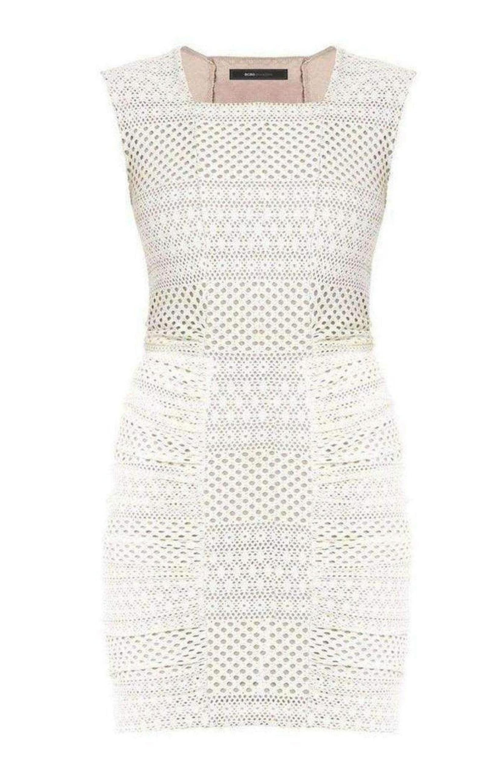 The Renee offers you a curve-skimming look with expert detailing to get you noticed at any event. Round neckline. Sleeveless. Ruching at sides. Lace knit with paneling throughout. Hits above the knee. Self: Polyester, Spandex. Lining: Polyester, Spandex.
