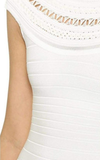 Braid and macramé detailing lend grecian allure to this romantic Herve Leger bandage gown. The floor-length silhouette is fitted through the hips, flaring into a graceful, trailing hem. Semi-sheer, off-shoulder neckline. Hidden back zip. Unlined. Fabric: Slinky, mid-weight knit. Off-the-shoulder. Sleeveless. Braided crochet pattern at neckline. Low back. Allover bandage construction 87% rayon/12% nylon/1% elastane. Dry clean